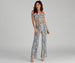 Make a major impression with a jumpsuit that showcases your stunning style! The jumpsuit features a snake print. an off-the-shoulder neckline. a cutout at the midriff. and straight-styled pants. Complete your look with clear mules and hoops.