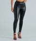 These fabulous faux leather leggings will have you strutting like everywhere is your runway! They feature a high-rise elasticized waist. trendy ruched side panels that go down the leg. and an all-over form-hugging silhouette. The sleek faux leather fabric offers plenty of stretch. Style these leggings with a corset top and clear heel mules.