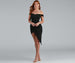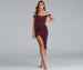 Create a major style moment with a midi dress that commands attention! The dress features an off-the-shoulder neckline with a sweetheart bust. no-slip strip. short sleeves. ruching. and a draped wrap silhouette. The dress is composed of a smooth knit fabric that offers a form-hugging fit with a moderate stretch. Complete look with mules.