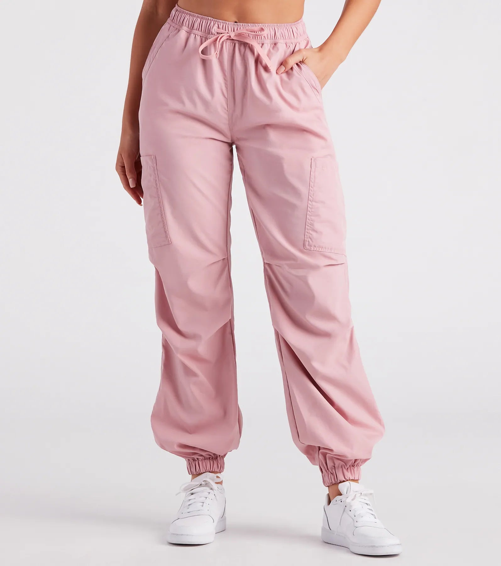 Amp up your casual 'fits with these trendy woven joggers! They feature a high-rise elasticized waist with a front adjustable drawstring. front pockets. cargo-style side pockets. a relaxed fit. and an elasticized jogger hem. Style with a corset top and mules for a dressier vibe!