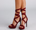 Impress the guests at the party with these stiletto heels! They feature a square toe. lace-up ankle. platform sole. and a faux suede exterior. Perfect for styling with a skater dress.