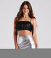 Make it dazzle all over town in this velvet crop top on your next night out! The top features a sleeveless square neck with sequin trim. adjustable spaghetti straps. sequin fringe. and back hook and eye closures. Style with flare pants to complete the look!
