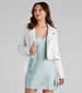 Edgy and chic. you can never go wrong with this moto jacket perfect for styling with distressed jeans for a night out. It features zipper long sleeves. a collared neckline. a front zipper with snap button closure. two faux pockets. side zipper pockets. and a belted waist with belt loops. Composed of PU-lined fabric with no stretch.