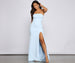 Make a memorable entrance with a dress that puts you in the spotlight. Makena features a sleeveless square neckline. a high side slit. and a bold open back design accented with criss-cross bar straps. Complete look with rhinestone heels and a glitter clutch.