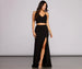 Bring some lace appeal to your evening as you stun in our one of a kind Mandy two piece dress! She features a sleeveless crop top with plunging V neckline. princess seams. padded cups and narrow straps that lead to unlined floral lace back with lower back strap accent. Her matching double lined skirt features a high rise waist. vertical seams. a high side slit and a zipper closure. Mandy is composed of a lined crepe fabric that offers a form hugging fit with slight stretch.