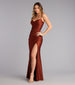 The Marcie formal dress is the showstopping style that demands attention! Designed in a flattering mermaid silhouette. this dress fits like a glove with a faux wrap design and high slit for allure.