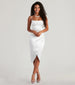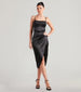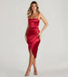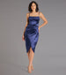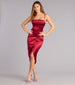 Wrap yourself in a glam formal dress that captivates from the moment you enter the room! Margaret features a sleeveless cowl neckline. adjustable spaghetti straps. corset seams with flexible boning. and a ruched wrap midi silhouette. The dress is composed of a satin fabric that offers a form-hugging fit with minimal stretch. Complete look with heels and rhinestone earrings.
