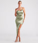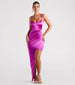 A luxe style with gorgeous detail. the Margret formal satin dress brings class and elegance to wedding guests. dinner formals. and banquets! She features a sleeveless V-neckline. spaghetti straps that cross in the back. and a pleated hip seam leading to the form-hugging asymmetrical silhouette with a stunning side slit cutout and long hem. The formal dress is composed of a buttery smooth silky satin fabric that reflects light with a subtle sheen effect. Complete the look in a statement necklace set and strappy heels.