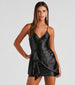 Radiate sultry glamour in the Margret satin party dress sure to leave a lasting impression! She stuns in a sleeveless v-neckline. spaghetti straps that lace up along her open-back design. and a curve-hugging. faux wrap mini-length hem with a ruffle. The formal dress is composed of luxurious silky satin fabric. Complete the look in linear earrings and heels.