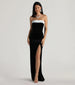A sleek satin trim on luxurious velvet shapes the Marilyn formal dress into a one-of-a-kind look! She features a strapless neckline with non-slip grip lining. a satin trim. a curve-hugging slim silhouette. and a flattering high front slit and floor-length hem. The formal dress is crafted from a luxe velvet knit fabric that offers an elegant allure and plenty of stretch. Complete your look for black tie parties and galas with earrings and a clutch.