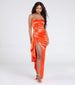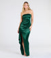 Decadence dressing is made easy in the Marilyn strapless satin formal dress! Capture sophistication in this floor-length dress with a high ruffled slit to show leg and a curve-flaunting fit.