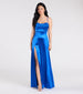 The Marissa long satin dress brings elegance and sultriness to your formal night. The floor-length gown enhances your curves with a fitted bodice and flattering A-line silhouette while the high front slit provides movement.