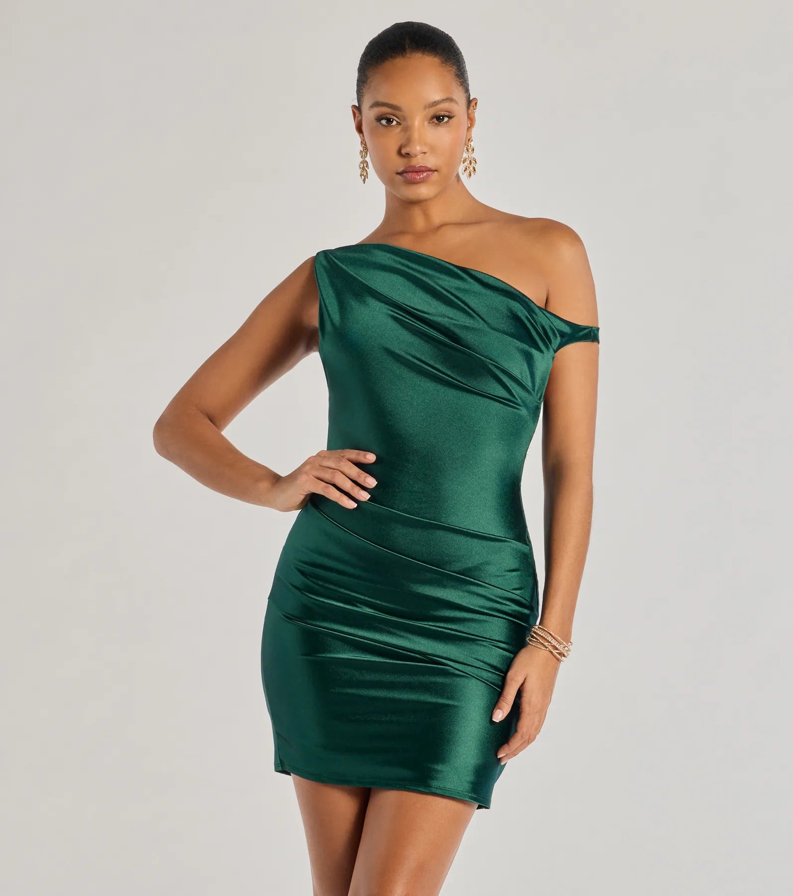 Sleek silky satin knit fabric gives the Marleigh mini dress its chic allure. perfect for your next formal party. It features an asymmetric off-shoulder neckline. pleated detailing at the bodice and waist. and a short bodycon silhouette to showcase your stunning curves.