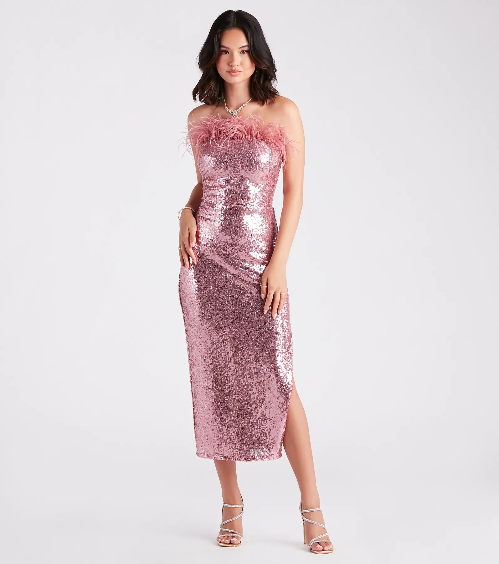Dare to be divine in the Marlin formal sequin midi dress at black tie parties and celebrations! She features a strapless neckline with a front feathered trim. non-slip grip lining. a lightly padded bust. a flattering bodycon silhouette. a side slit accent. and a fitted midi-length hem. The formal midi dress is composed of a sequin-embellished mesh fabric that sparkles under the light and a stretchy knit lining. Complete the look with an elegant hair accessory for a glam style!