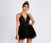 Twirl the night away in our absolutely adorable Massie formal dress! She features a sleeveless bodice. adjustable spaghetti straps that lead to a cross back. a plunging V neckline. a high waist seam. a back zipper and hook and eye closure. and a double layered tulle short skirt. The dress is composed of a sheer tulle fabric with an all over velvet floral pattern. and includes a stretchy knit lining.