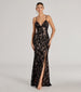 Showcase chic luxury at black-tie galas in the Mckenna formal dress crafted with sheer floral lace fabric with a velvet flocked design and a nude-tone lining. It features a sleeveless V-neckline with a ruched padded bust. spaghetti straps that lead to an open back with a lace-up strappy design. a high-cut front slit. and a floor-sweeping mermaid silhouette to hug your curves.
