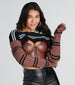 Who says you can't have it all? Achieve an elevated fashion fit' with this striped sweater topper featuring contrast striped loose long sleeves for a look that is both cozy and chic. a distressed crew neckline. and a contrast striped design on soft rib knit fabric. Style over a sleek corset top for an edgy look for a dinner and movie!