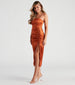 The drama's in the details when it comes to the stunning Melany satin midi dress perfect for upcoming family dinners and parties! She features a sleeveless pleat square neckline. chain link trim adjustable spaghetti straps. a form-hugging fit. a slit accent. and a front side ruched drawstring so you can customize her fit. The formal dress is composed of sleek satin woven fabric with a knit lining and minimal stretch. Complete your dressy look in stiletto mules and a clutch.