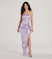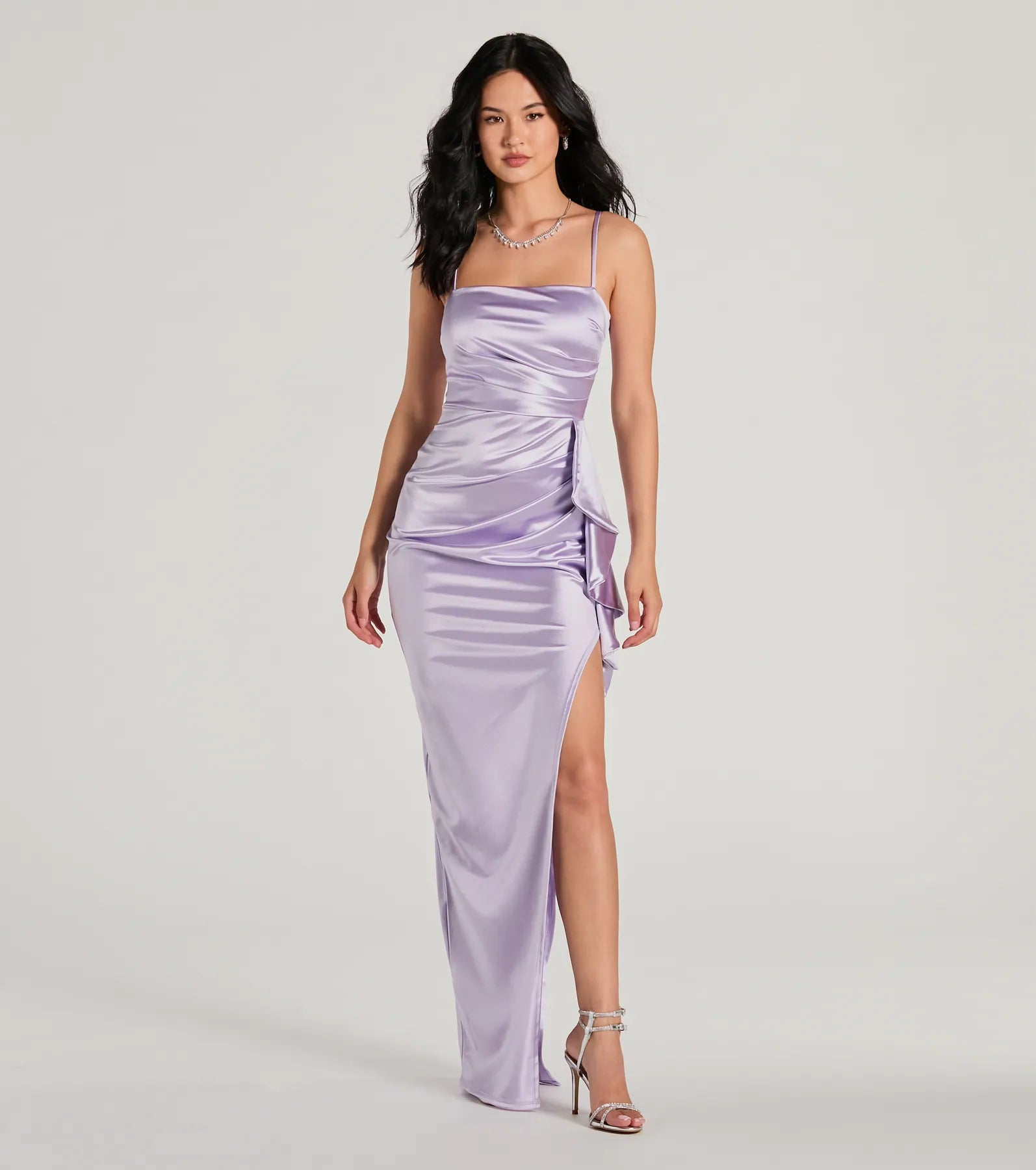 Impress everyone with your impeccable taste in the Melissa satin formal dress perfect for wedding guests. bridesmaids. or attending a fancy soiree! Crafted from luxurious satin. this slim fit dress features a square neckline and delicate spaghetti straps. The ruffled high-side slit adds a touch of drama. while the long-length hem exudes elegance. Complete the look in dressy block heels and a clutch for a glamorous night.