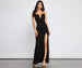 Elevate your formal wear with a stunning dress that stands out for your special evening! Meriah features a sleeveless square neckline. a U-shaped insert with underwire. adjustable spaghetti straps. and an A-line silhouette with a high side slit. The dress is composed of a lined crepe fabric that offers a form hugging fit with a moderate stretch. Complete look with heels and a rhinestone anklet.Â