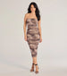 Step out and mesmerize in a midi dress that features a sleeveless square neckline. ruching throughout to enhance curves. and an abstract marble print. Complete look with strappy heels for a look that's ready for date night!