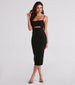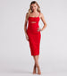 Simply chic. the Mia formal midi dress is a must-have style for cocktail parties or as a guest at weddings! She features a sleeveless square neckline. spaghetti straps. an alluring small cutout under the bust. a midi-length hem with a fab back slit accent. and a form-hugging silhouette. Complete the look with strappy stilettos.