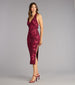 Fall florals. but make them sultry. This halter midi dress features a plunging neckline and all-over floral soutache design that catches the light with every move. With its body-skimming fit and subtle side slit. it's made for candlelit dinners and dressy occasions!