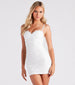 They can meet you at midnight! Bring the romance to date night in this lace mini dress featuring a sleeveless sweetheart neck with an eyelash lace trim. built-in padded cups. adjustable spaghetti straps. and a bodycon silhouette. The sheer lace fabric includes a full knit lining. Style with a ring set and earrings to complete the look!