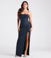 Embellish a little this party season in the Mikayla formal glitter dress to sparkle at weddings or black-tie events! She features a sleeveless square neckline. spaghetti straps. a lace-up open back with tie closure. a form-hugging slim silhouette. and a stunning high front slit and long-length hem. The formal dress is composed of a shimmery glitter knit fabric with a sewn-in knit lining and moderate stretch. Complete the look in fringe earrings and strappy heels.