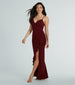 Elevate your formal attire with the Miley crepe formal dress perfect for bridesmaids. wedding guests. or black tie parties! This sophisticated gown is designed with a surplice V-neckline and spaghetti straps. creating a slim silhouette that hugs your curves. The high front slit with ruffle trim adds a touch of elegance. while the floor-length hem on polished crepe fabric exudes luxury. Complete the look with fringe earrings and heels.
