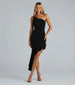 Mix and mingle in this crepe midi dress looking like a chic sensation! The sleeveless dress features a one-shoulder neckline. a form-hugging fit. and an asymmetric midi-length hem creating a flirty high side slit with a ruffle trim. Complete the look in rhinestone heels for a dressy occasion!