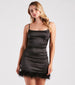 Step out looking like Miss. Diva in this satin mini dress on those nights when you wanna be a little extra! It features a sleeveless square neckline. adjustable spaghetti straps. a bodycon silhouette. and a marabou trim along the hem. Complete the look in fringe earrings for a dressy dinner date or birthday!