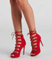Live up to your name in these showstopping stiletto booties featuring an almond peep toe. a cutout design with lace-up straps. and a back zipper closure on faux suede material. Complete the look in a sultry sweater dress.