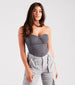 Keep your look modern and posh in this pinstripe corset top! Featuring a strapless neckline with non-slip grip lining. flexible boning inserts along the bodice. a fitted crop hem. and multiple back hook and eye closures. The corset top is designed with a chic pinstripe print on lined smooth woven fabric. Complete the look with chic wide-leg pants for a wine bar!