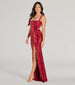 Shimmer like never before in the Moira sequin formal dress that brings glamorous sparkle to charity auctions. black-tie galas. and dances! Turn heads in the flattering sleeveless cowl neckline and a lace-up open back that lets you customize the style. The form-fitting silhouette accentuates your curves and features a high front slit that adds a sophisticated detail along the floor-length hem.