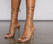 Create a luxe moment in heels that reflect glamour and glitz. The heels feature lace-up rhinestone and faux patent leather straps. a multi cross-strap design. an open almond toe. and a gorgeous rose gold-tone. Complete look with a LBD.