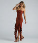 Take on timeless style in this strapless midi dress for enchanting moments at every soiree! The knee-length dress features a strapless neckline. a bodycon silhouette. dual front slits. and cascading ruffle trim down to the hem to create a voluminous effect. The smooth knit fabric offers plenty of stretch. Complete the look in strappy heels.