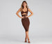 This midi dress deserves a moment of admiration! It features a sleeveless. v-neck. tank straps. a sultry twisted bust with cutout detail. and a bodycon silhouette on stretchy rib-knit fabric. Complete the look in strappy heels for date night.