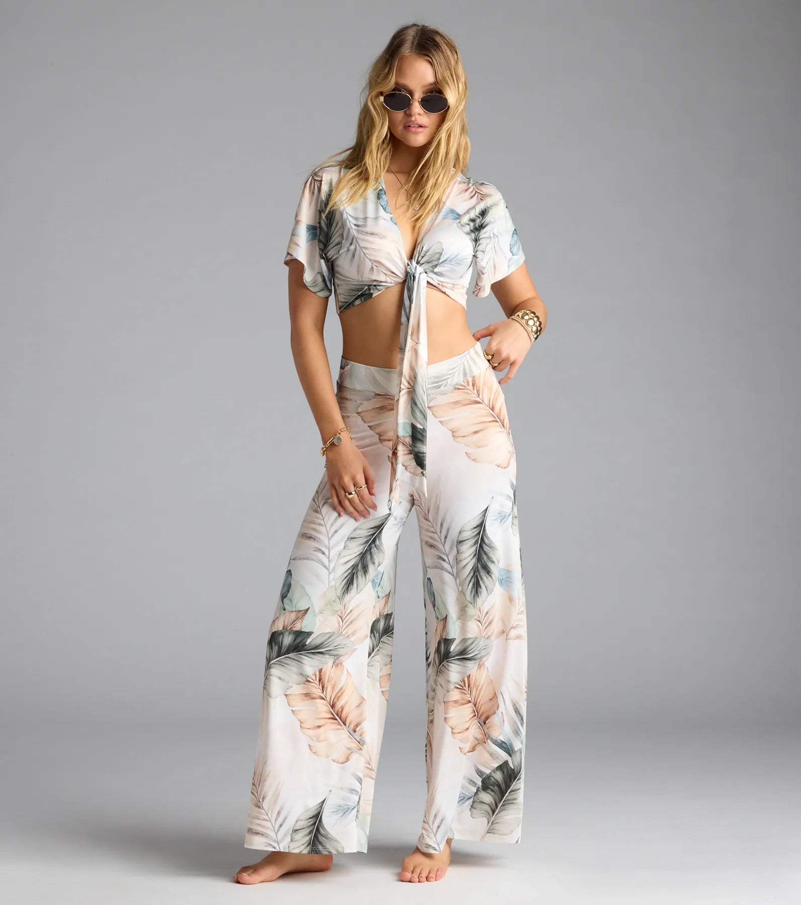 Waking up in paradise got sweeter with these tropical pants in your luggage! It boasts a flattering high-rise waist and a flowy wide-leg design perfect for styling over a swimsuit Pair with the matching top.