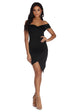 You can't go wrong with this flattering black asymmetrical dress! It features a sweetheart. off the shoulder neckline. a high waist seam. large pleats at the hip that create a wrap skirt with a subtle asymmetrical hem. Dress has an overall slim fit and is composed of an unlined. smooth knit fabric with a moderate stretch.