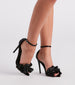 Show up fashionably late to the party in these satin stiletto heels! Featuring a pointed toe. a ruffled toe strap. a closed ankle. and an adjustable ankle strap with buckle closure. Complete the look with a statement ring set and clutch.