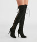 Steal the scene in these sassy over-the-knee boots featuring a trendy pointed-toe. stiletto heel. side bungee lace-up sides. and inner zipper closure. composed of smooth faux suede material. Complete the look in a short dress for a night on the town!