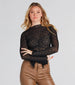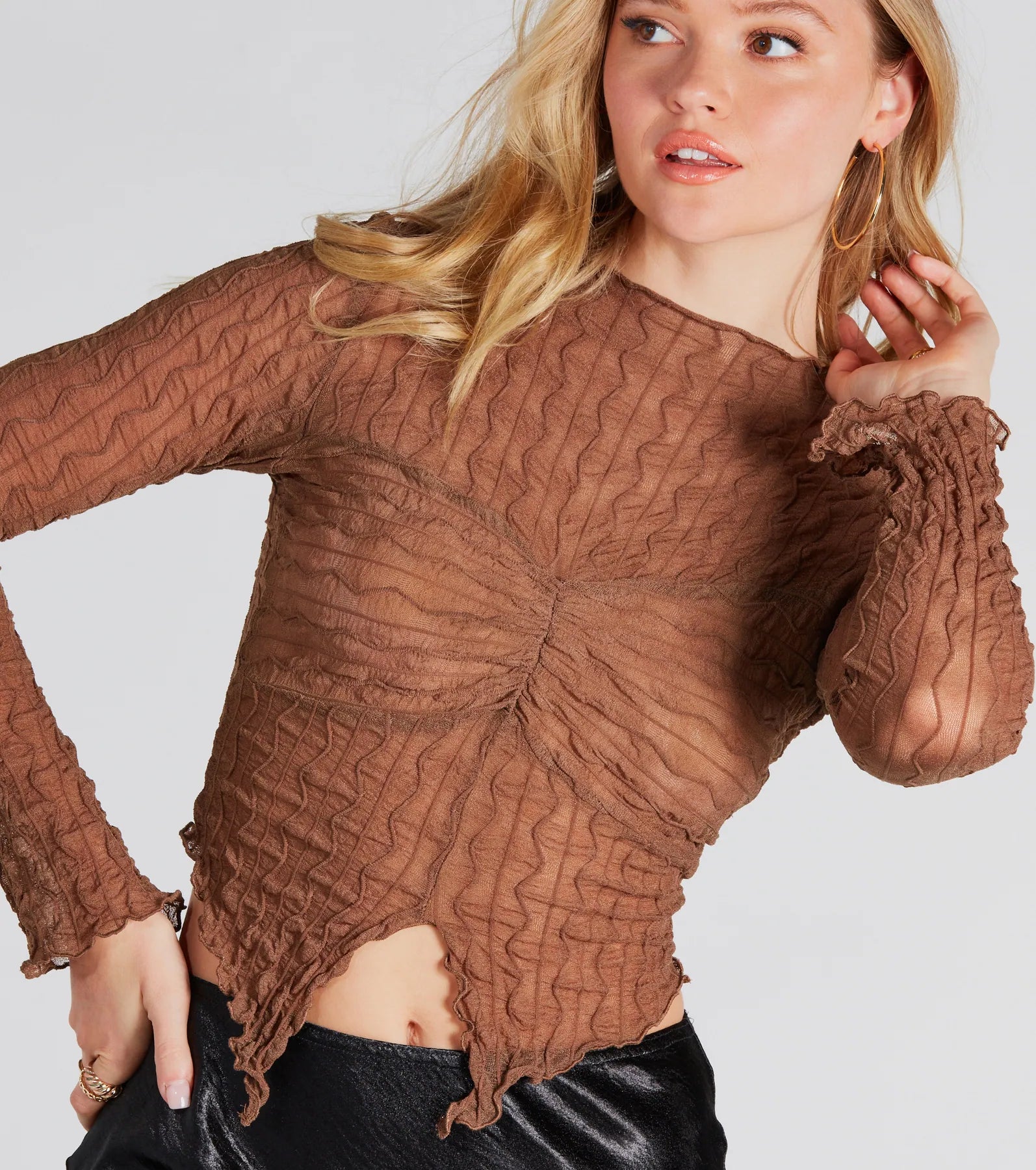 Look effortlessly chic in this mock neck crop top. Crafted from a textured sheer knit fabric. this top features a mock neckline. center front ruched seam and slit. and long sleeves with flare cuffs for an elevated look. Style with high-rise pants for grabbing dinner and drinks!