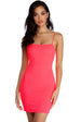 Make a flirty appeal in neon! This must have mini dress features a neon coral hue. a square neckline. narrow shoulder straps and a mini length. The fitted dress is composed of a lined scuba fabric that offers a moderate stretch.