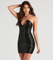Enter into a new era of 70s-inspired style! This sequin club dress is designed to flaunt your curves and catch the dance floor lights. It features a sleeveless. halter neckline. sleek adjustable spaghetti straps. a ruched cutout bust. and a mini. bodycon silhouette. Complete the look in rhinestone earrings and heels.