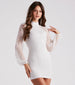 Enter into a romantic fashion era starting with this swoon-worthy lace mock neck dress featuring peasant long sleeves. dual button neck closures. a bodycon silhouette. a mini-length hem. and a sultry open-back with chiffon tie closure. Complete the look in lace-up heels.
