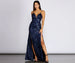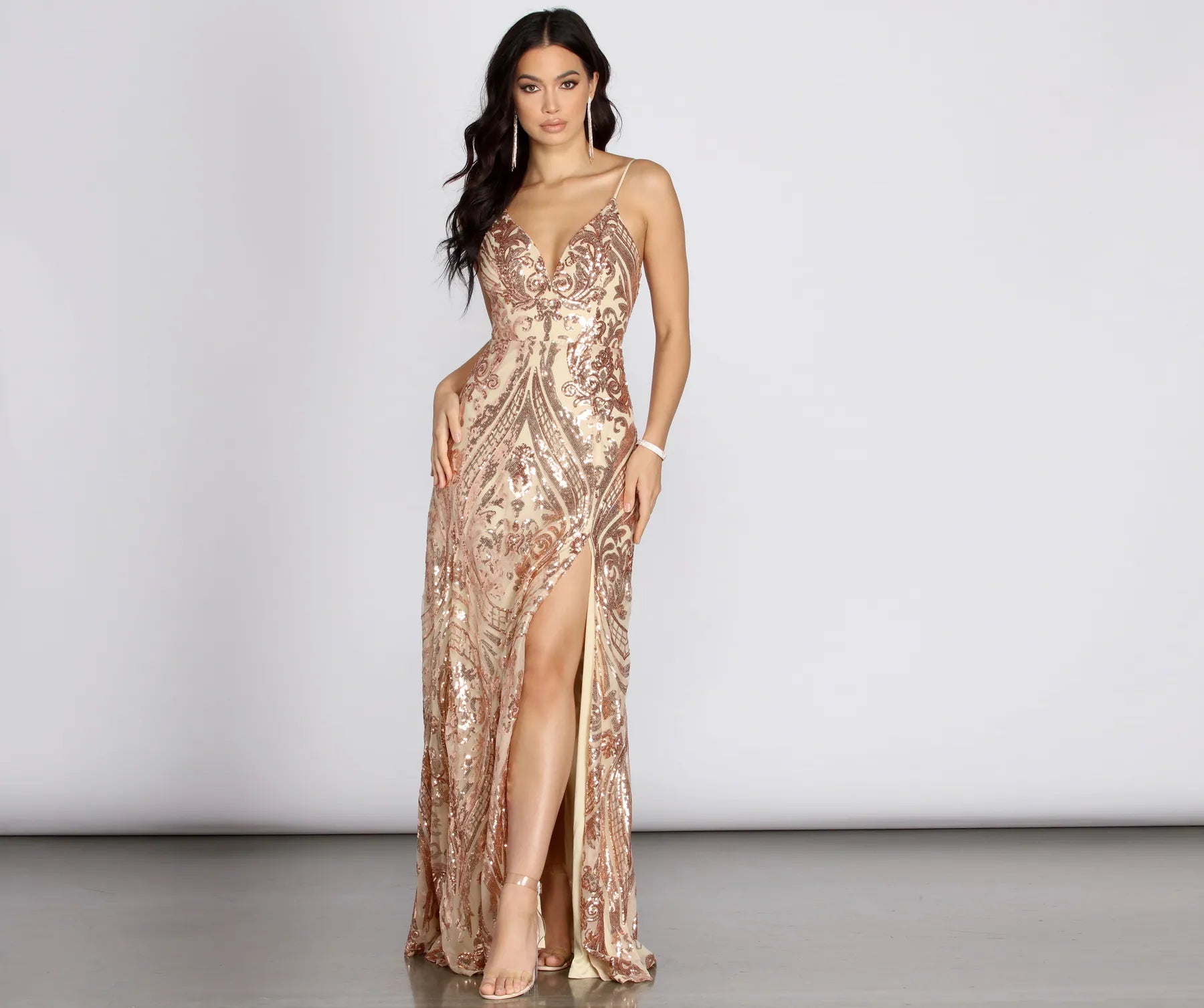 We just can't get enough glamour! Light up the night with our twinkling dress! She features a sleeveless bodice. a plunging wired V neckline with narrow adjustable straps. and flattering princess seams. Her bodice leads to an elongating floor-length skirt that is accented with two high front slits to bring the drama! Her all-over sequin scroll design is all you need to make a memorable impression! She is composed of mesh fabric that offers a form hugging fit with minimal stretch. She includes a back zipper closure and is lined with a thin knit fabric. Complete look with rhinestone heels.
