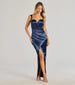 Bring elegance in a long satin dress with a plunging sleeveless sweetheart neckline with pleated detailing. tank-shoulder straps for additional support. and a pleated wrap silhouette that creates a high-slit illusion. Complete formal outfit with a rhinestone collar necklace set.