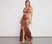 Keep it sleek in our Nikita dress that brings the elegance to your formal evening. She features a plunging sleeveless wrap V-neckline. padded cups that eliminate the need for a bra. sleek spaghetti straps. a ruched silhouette that enhances curves. and a floor-length silhouette with a dramatic asymmetrical high slit. Complete your look with rhinestone earrings and clear heels.