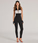Show off your need for speed this Halloween in a jumpsuit that features a mock neck with a plunging zippered V-neckline. checkered print panels from bodice to hem. and a skinny leg fit. Complete your costume with matching faux leather gloves and stiletto heels!